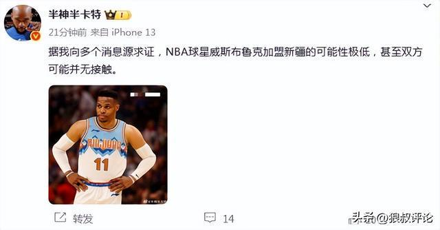 不久从媒体人“半神半卡特”报道,据我向多个消息源求证,NBA球星威斯布鲁克加盟新疆的可能性极低,甚至双方可能并无接触。