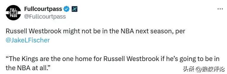 据NBA名记Jake Fischer报道,威少新赛季有离开NBA的可能,因为国王队是唯一一支对他感兴趣的球队。